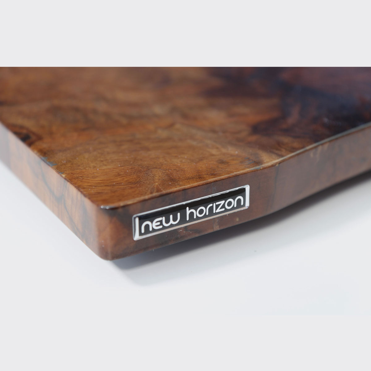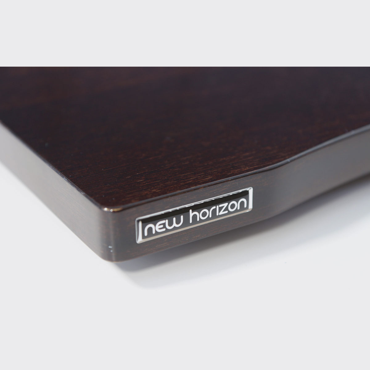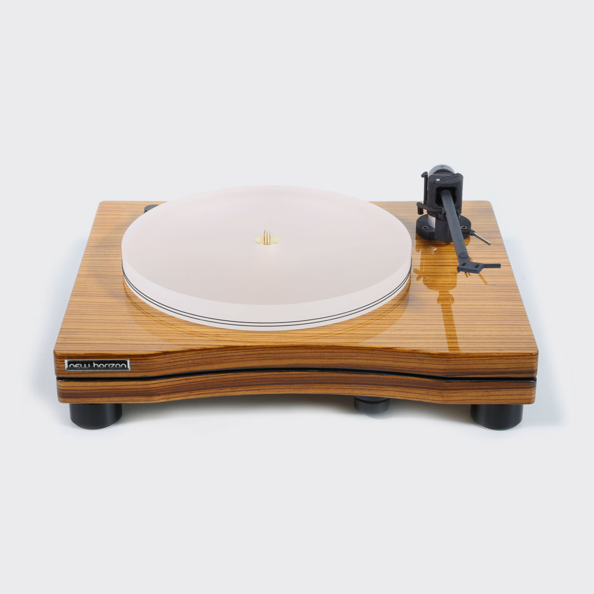 Der New Horizon GDS II ist das Prunkstück von New Horizon. Ein 25 mm hoher Sockel, der mit drei Stahlfedern ausgestattet ist, dient als Subchassis. In diesem Sockel ist der Motor mit vier abgestimmten Federn aufgehängt. Ein zweiter 25-mm-Sockel beherbergt das invertierte Messinglager und den neu gestalteten und im Haus gefertigten New Horizon 9-Zoll-NH95-Tonarm aus Alumide®. Neben Azimut und Antiskating kann auch der vertikale Nachführwinkel (VTA oder Tonarmhöhe) eingestellt werden.