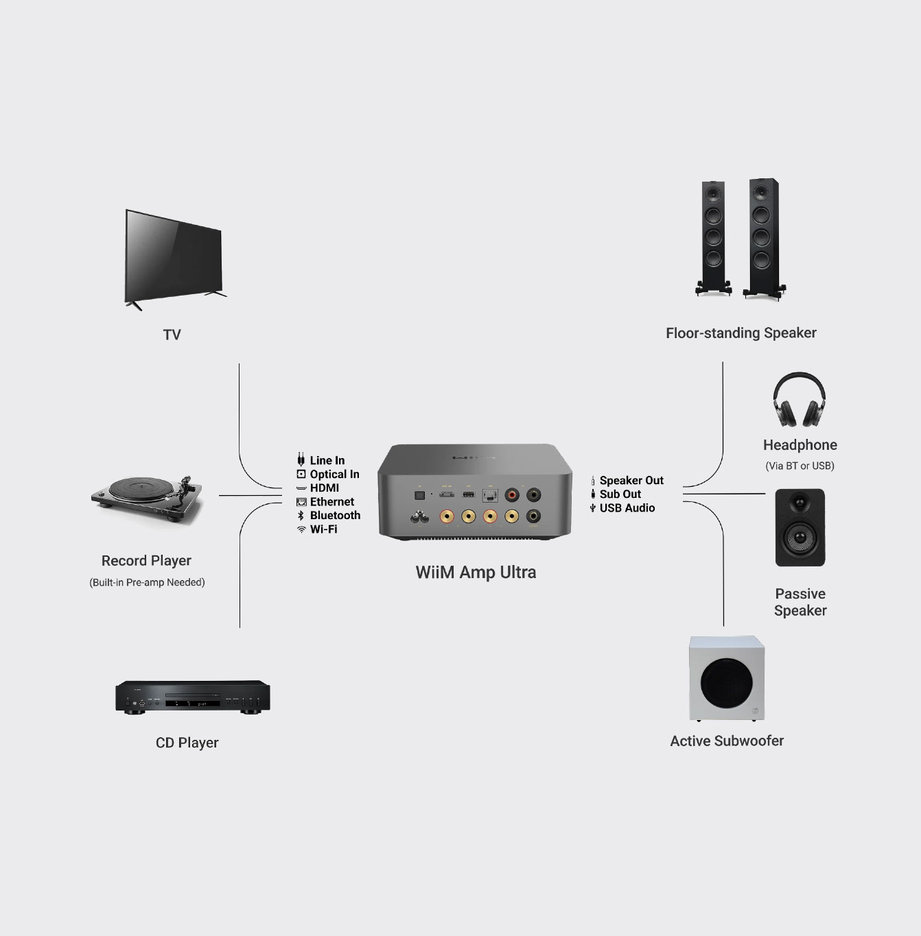Verbinde deinen Fernseher über HDMI ARC, schließe einen Plattenspieler über den analogen Eingang an (mit externem Phono-Vorverstärker) oder streame kabellos über Wi-Fi 6, Bluetooth 5.3, Spotify Connect, TIDAL Connect, Chromecast Audio und mehr. Der Amp Ultra ist sogar Roon Ready (Zertifizierung steht noch aus) und unterstützt Multiroom-Audio über Google Home, Alexa oder das WiiM-eigene Ökosystem.